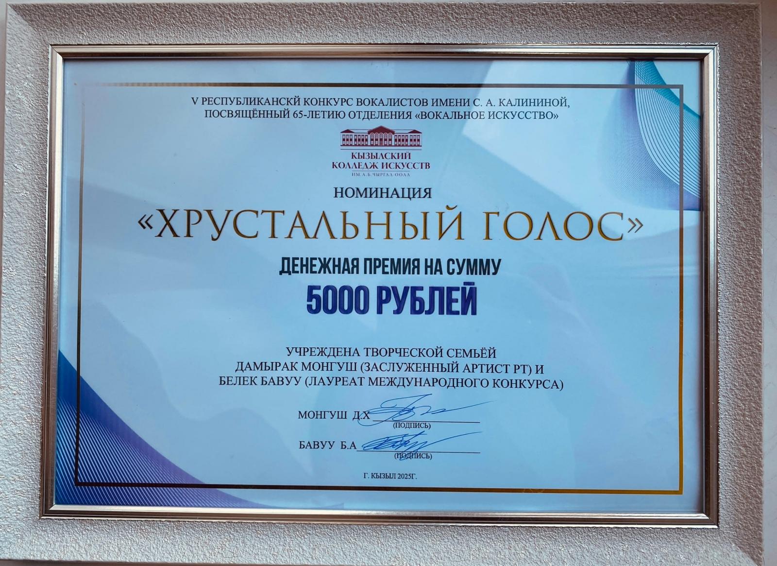 В рамках празднования 65-летнего юбилея вокального отделения Кызылского колледжа искусств им. А. Б. Чыргал-оола прошёл V Республиканский конкурс вокалистов имени С. А. Калининой.  В конкурсе приняли участие самые талантливые вокалисты со всей республики. Он стал особенным, так как был посвящён 65-летию отделения «Вокальное искусство», Году защитника Отечества и 80-летию Великой Победы.